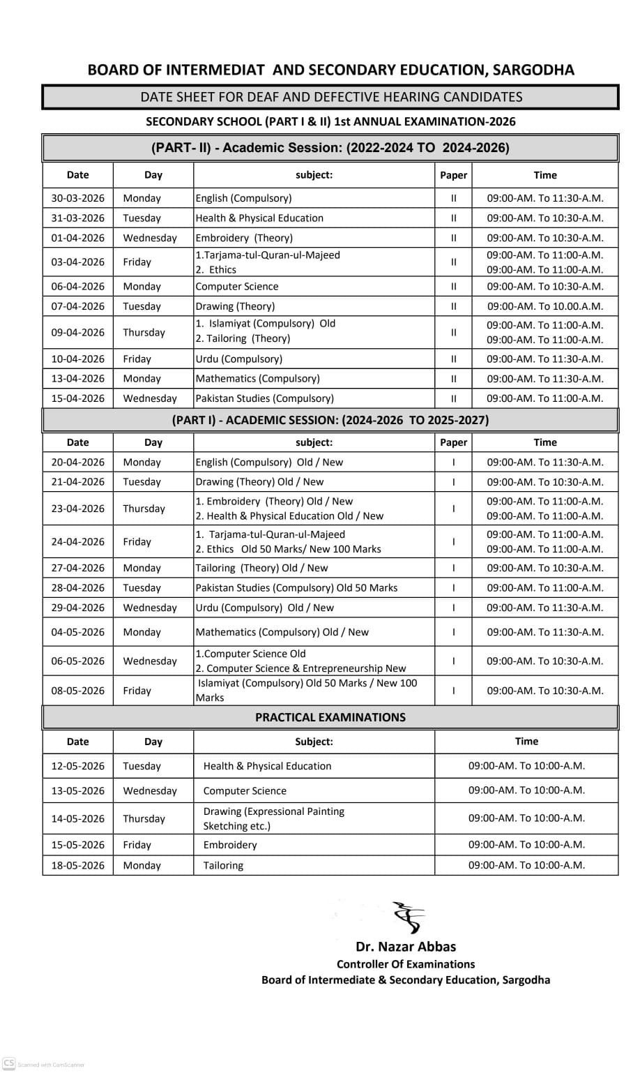 SSC 10th Class Date Sheet 2026 BISE Sargodha